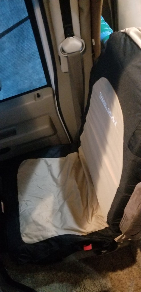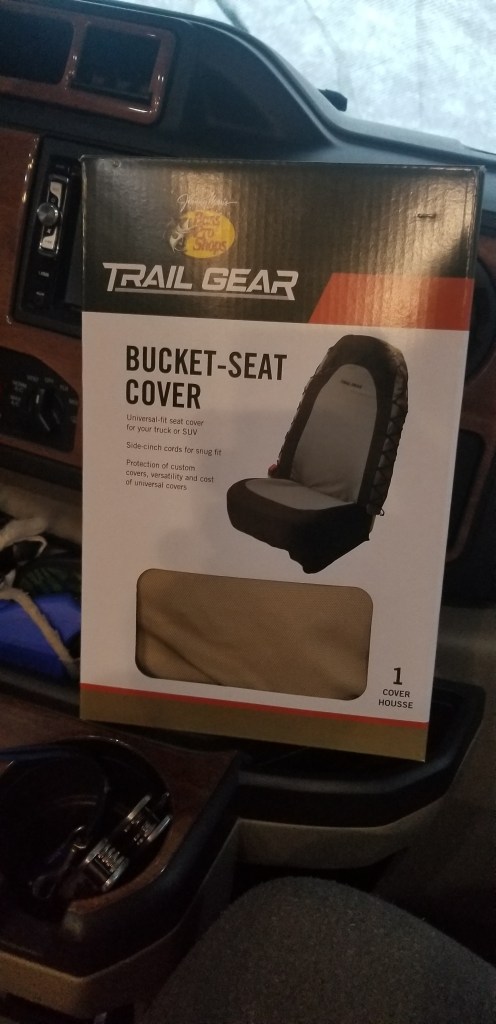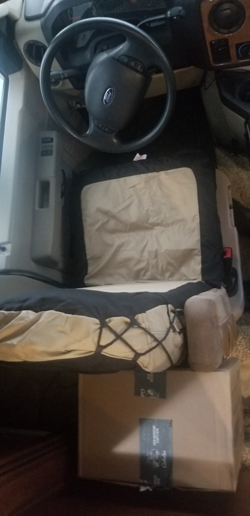 One day I stumbled on to the Forest River Forums and read a person highly recommending a Cabala’s truck seat cover. That person posted a photo and then I began my quest seeing if these would fit. The seat covers have a limited color choice. Our coach is very dark and we were hoping to add some color to the area but in the end we decided to purchase the light brown covers.