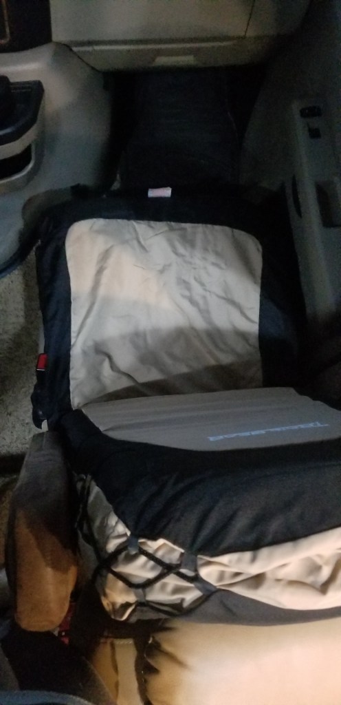 At $20 per seat, these covers were a bargain. The installation was surprisingly easy with minor hitch; our coach seats have no open space between the seat back and the seat. The installation of the seat cover straps require to sneak the strap though this opening (which our seats don’t have) so the seat cover can be tightened up. In the end, this wasn’t a huge issue since tucking these little straps into the crease between the back and seat area seems to be sufficient to keep the cover in place. Additionally the seat covers have velco openings to allow the arm rest through the cover so no cutting was required.