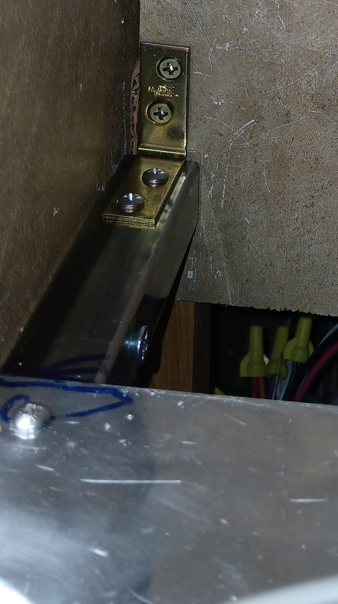 We managed to make it back home to Connecticut without incident and I proceeded to investigate was was happening to the mount. Apparently all the bad roads and time took it’s toll on the two #10 wood screws; they pulled free from the exterior wall and the water heater partially collapse. Doing a bit of math, the when the water heater is full of water the tank and water in the the tank weigh in at nearly 90 pounds. All that weight, not secured to the shelf and held secure by only two wood screws just was a bad design.