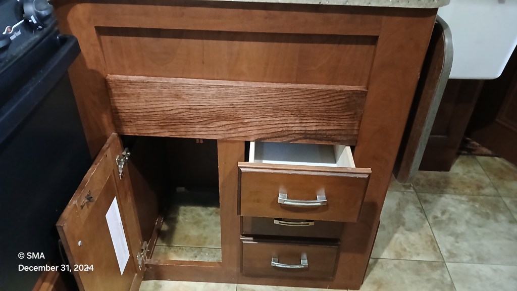The Oak wood piece is about twice as heavy as the original fake paper wood product that Jayco installed, but should prove to much more substantial. Jayco products are considered one of the better built RV products on the market, but I’ve seen many sub-par products installed in our coach. Perhaps I’ll get ambitious in the near future and replace more of the fake wood in the kitchen area.