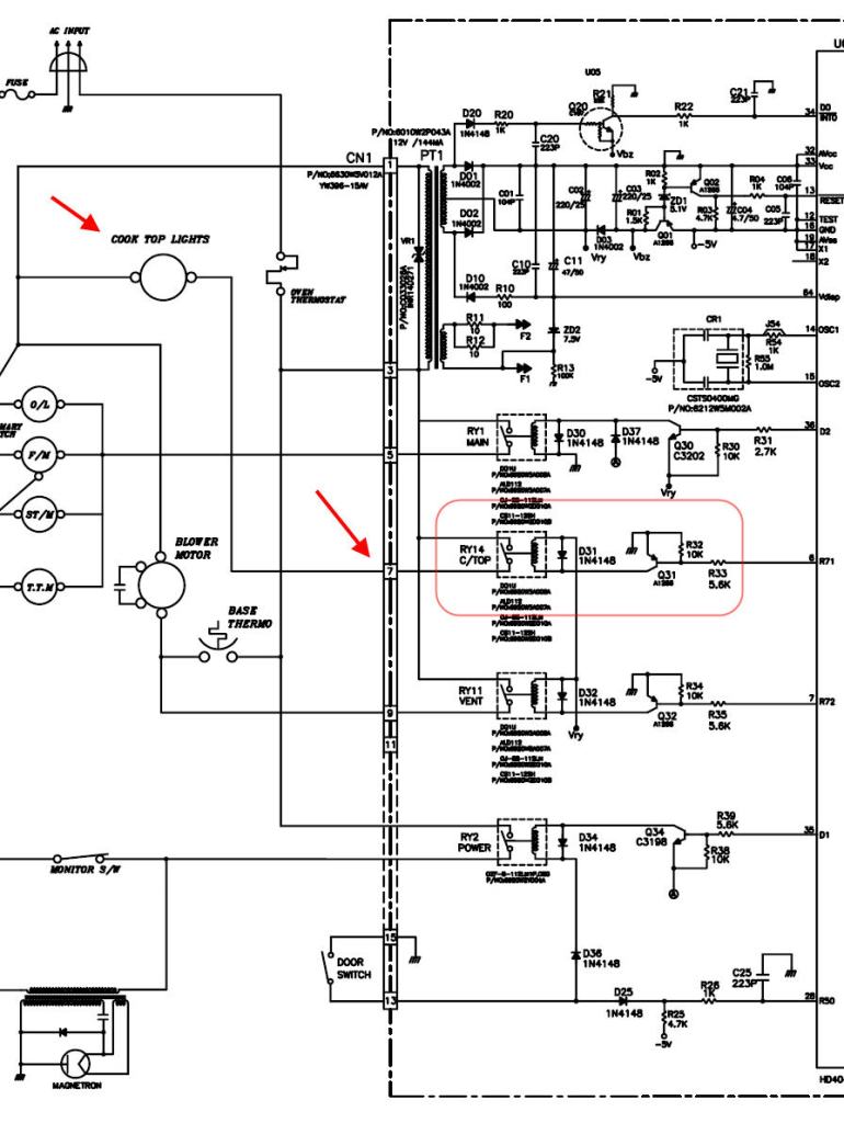 The search was fruitful and I found the full service manual for the microwave. Below is a snapshot of the suspect area;