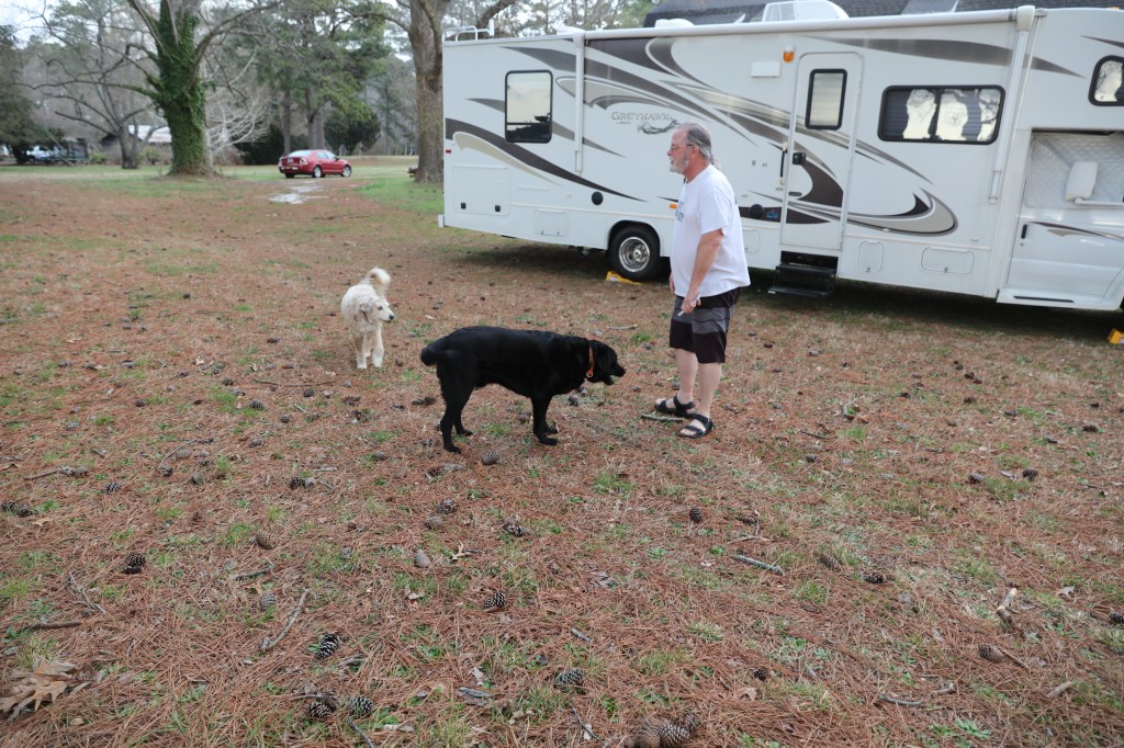 Very nice sleeping weather last night and the pets didn’t wake us up until 5AM today! Very wet today and rain is in the forecast but the rain is needed. Had our coffee, breakfast, and ready to start the day in Greenville. The downside of travelling with pets; Snickers nocked the cat litter box over…. argh. Clean up time. Next, lets play in the water “Stop playing in the water!”. Oh, and then there is Thelma who never does a naughty indoors. Well today she wasn’t feeling to well after breakfast. She seems fine now but the day will tell.