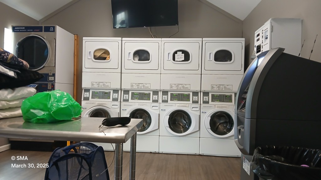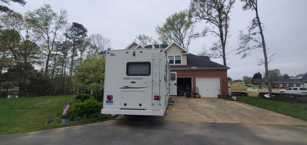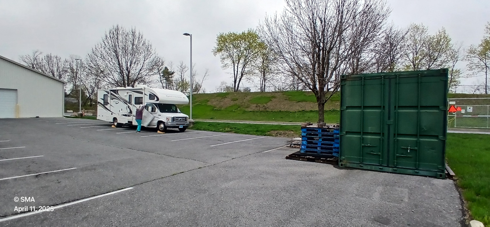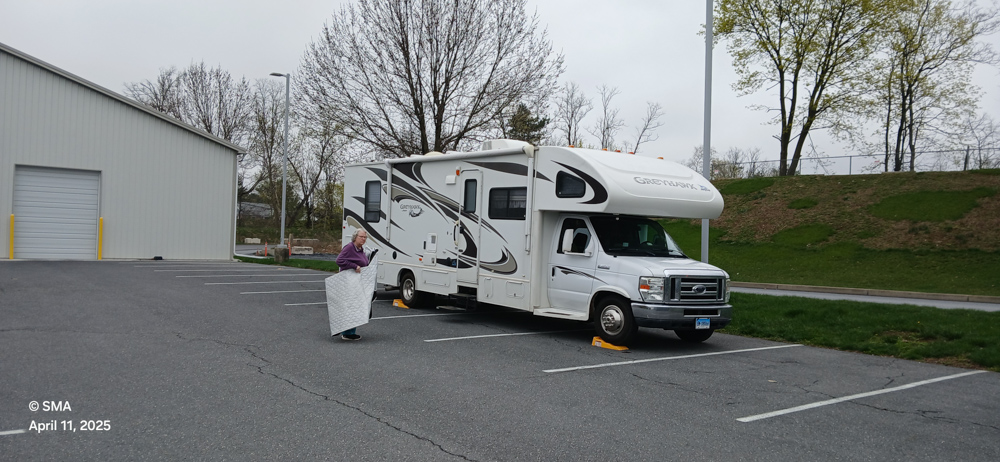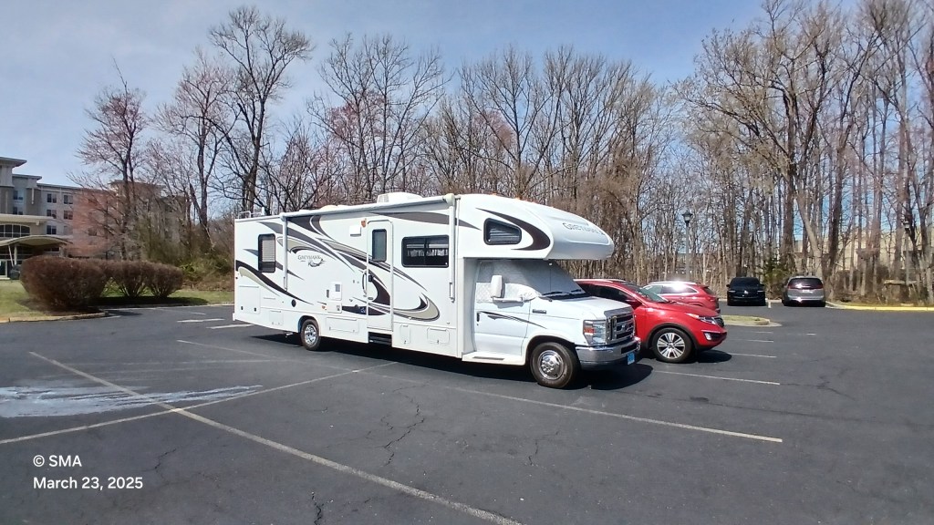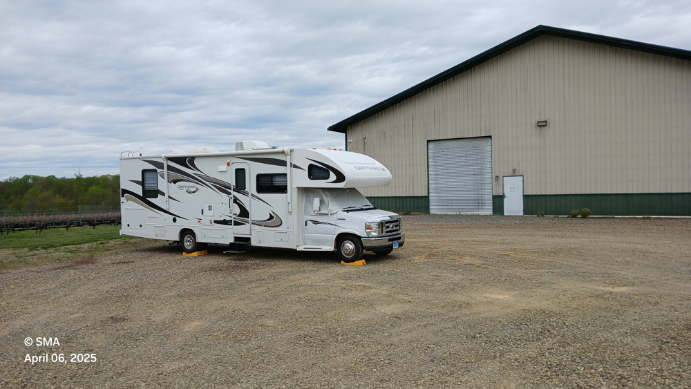 We would have been in VT and riding the bikes on a nice trail overlooking a huge lake viewing into Canada today but instead the coach sits in our driveway here in Connecticut. My mobility is reduced but I am ambulatory so I’m thankful for that. Now comes the task of unloading the coach of everything we stowed for the 2025 season. Leaving food, blankets, pillows, etc., in the coach of the winter is just an invitation for critters to make themselves at home and in the process wrecking the coach. Previous owners parked Coachella in storage area, but that’s not the best thing for a coach unless you plan to inspect it weekly and start the generator. We keep Coachella right at home and nearly everyday take a walk through to make sure everything is intact.