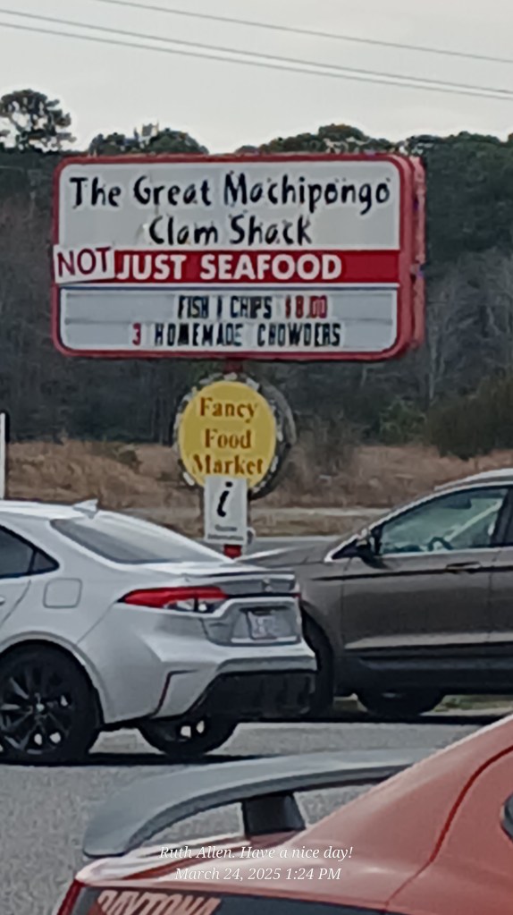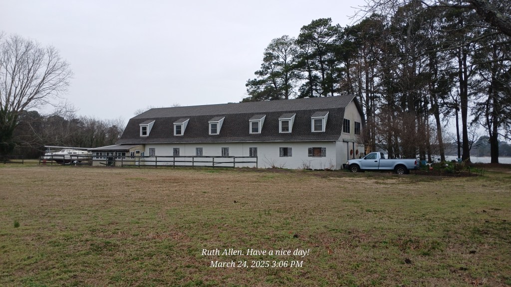 Breakfast at 7AM at the Cracker Barrel in Mount Laurel. Rainy morning and rain most of the way to our next destination. Rain makes for long days when driving, the 5 hours on the road felt more like 12 hours. Made our way to The Great Machipongo Clam Shack. We started going to this place probably 15 years ago on our way to the Outer Banks. The owners want to retire, so the place is for sale (only $1.4M). Our final stop today was only about 4 miles from the Clam Shack, so after lunch we headed over and met Federico and told us where to park. We are over looking a large river that dumps into the Chesapeake Bay. We can see the Bay to the left of our coach. Very windy and rainy but should pass by 7PM tonight. Hoping for no winds tomorrow else we will have to wait to cross the Bridge/Tunnel.