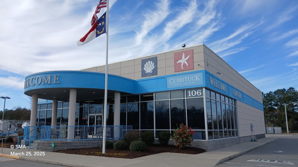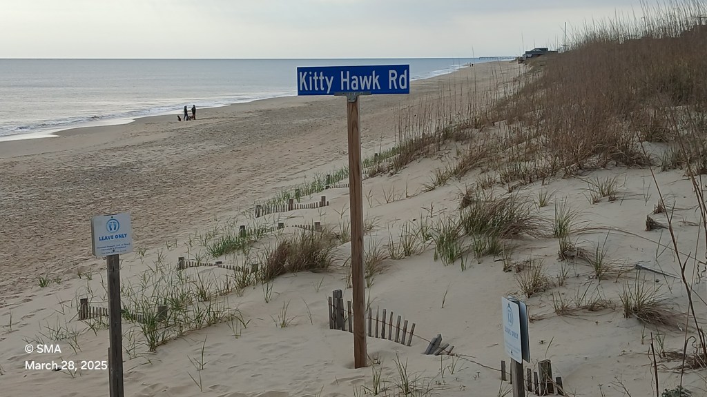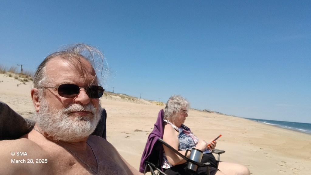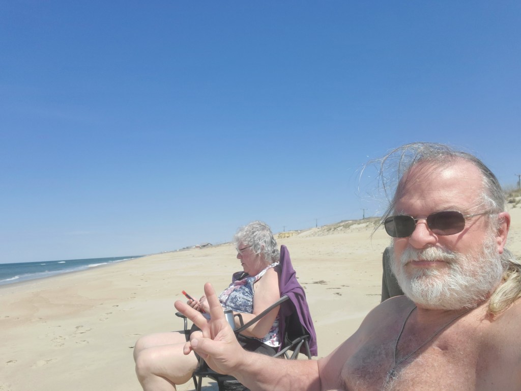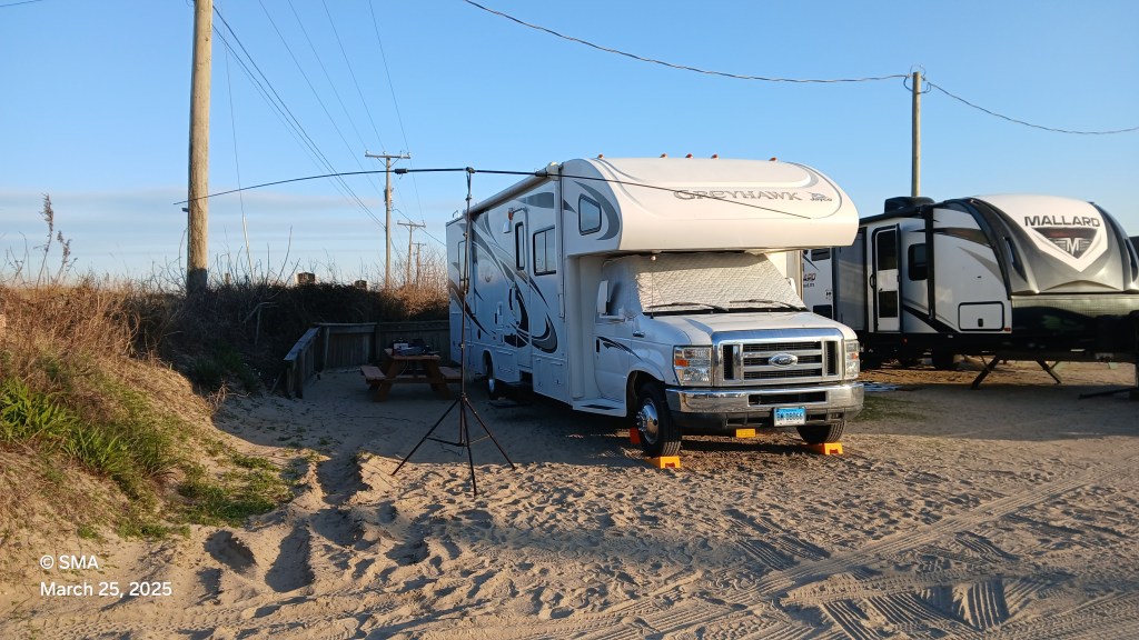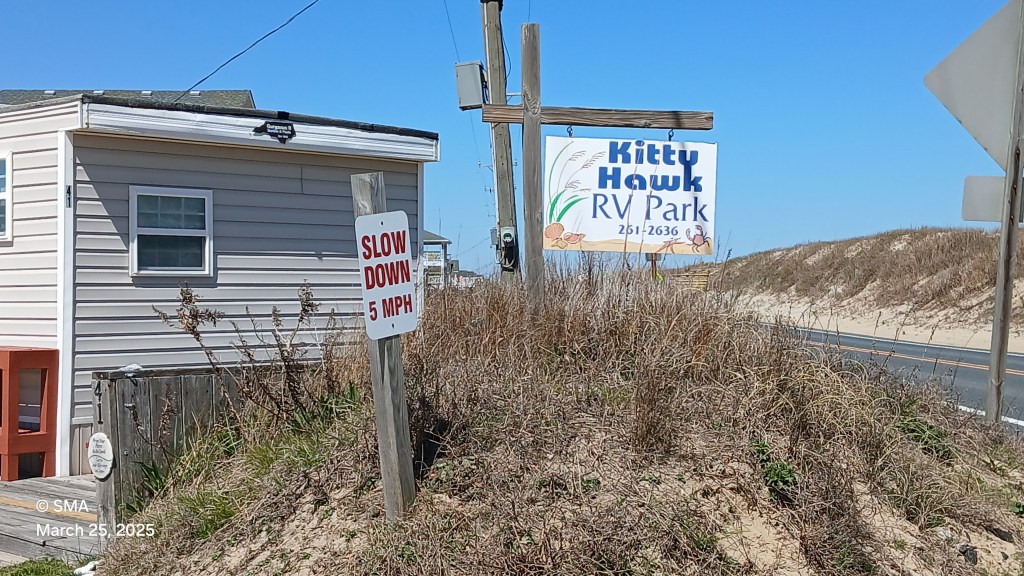 When we are on the road, sleeping late is not an option. Caramel was crying in my ear at 3:45AM wanting me to get up. 4AM Cats were fed and dogs were out (had to do this before Pitch and Daisy were out). Super quiet here and the views are just awesome. The trek to Kitty Hawk was an easy ride. The bridge / tunnel was pretty easy and traffic was manageable for a week day even thru Virginia Beach. Set up about 200 feet from the ocean, just over the dune. We took the dogs there and they loved it. The camp sites are real tight here. The plan was to use our eBikes but the only place to ride is in the road to get to the bike path which is about a mile away. So eBikes arestaying stowed away. Great weather, 50s in the AM with 60s by mid day. Beach is great and the dogs love running around.