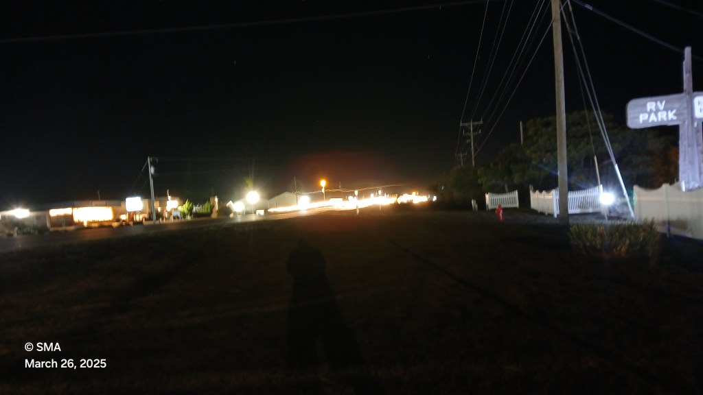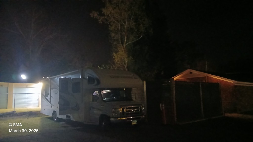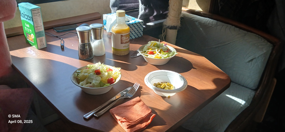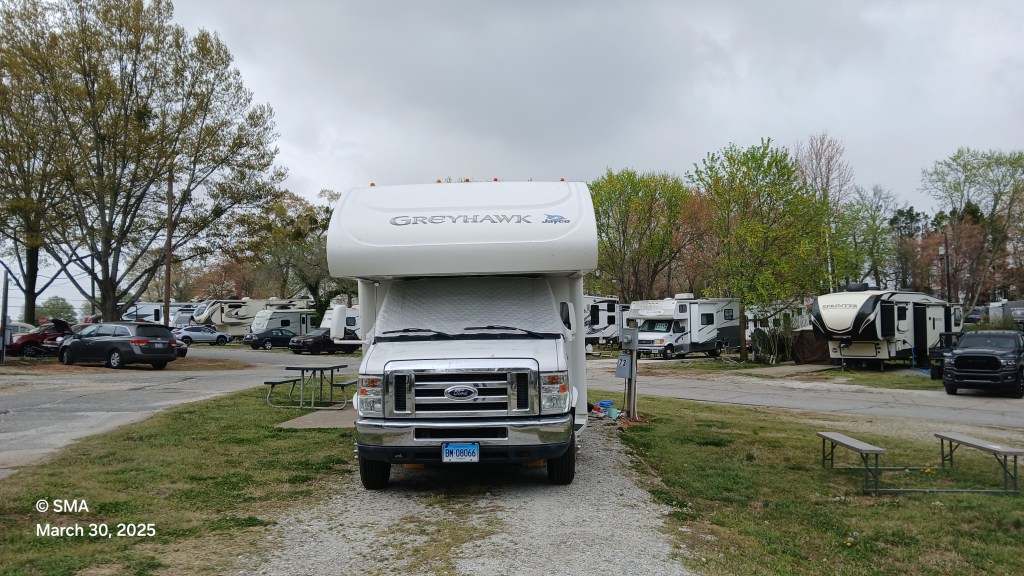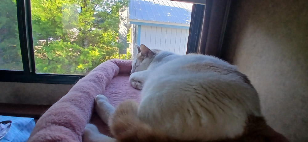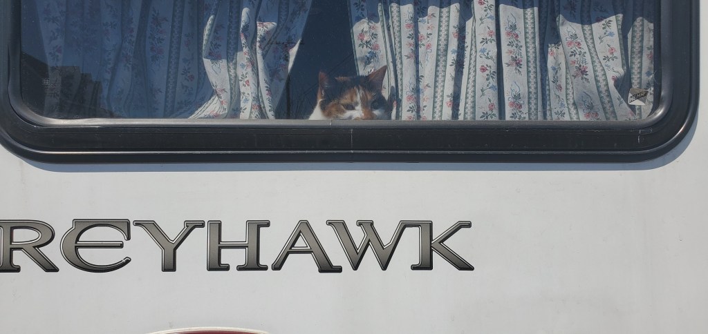 We had a nice visit with Ruth’s Aunt and Cousin Shelia and Leah. They too commented about this RV park. They said it was worse and they’ve cleaned the park up a bit. Our site is nice and quiet with song birds singing and not much road noise. Our three cats like looking out at the birds and the occasional cat that wonders by. Today we are heading out for lunch with Ruth’s cousin Alex and tomorrow a dinner with more of the family.