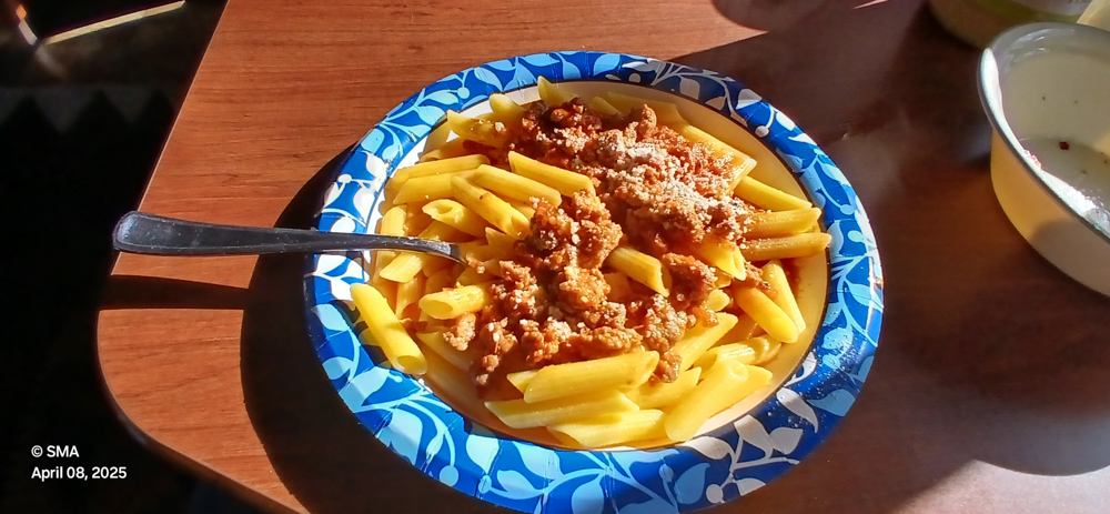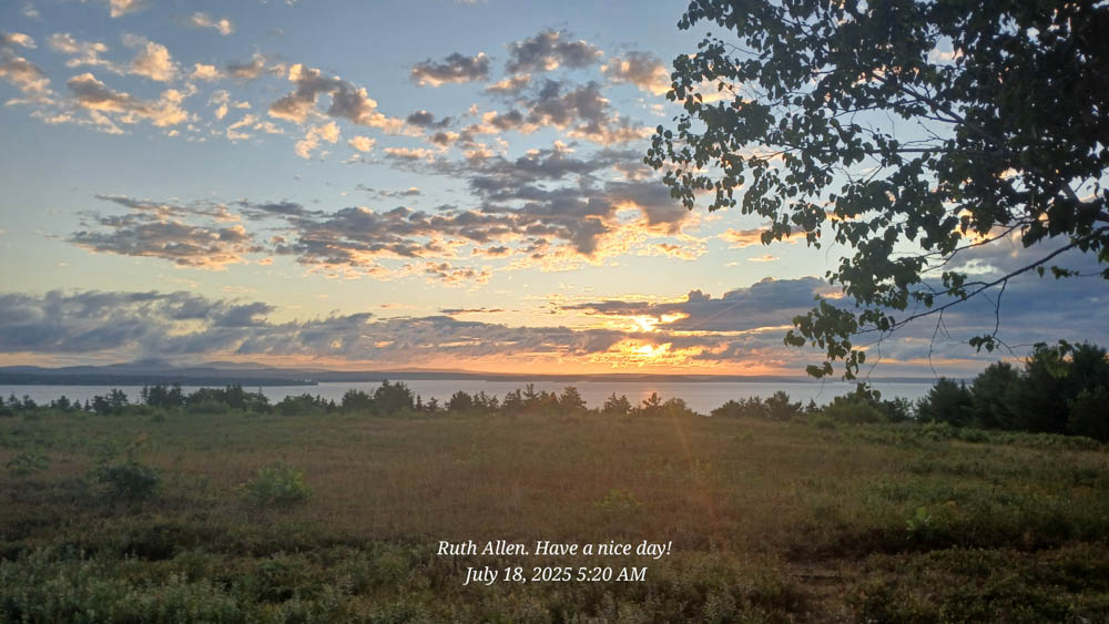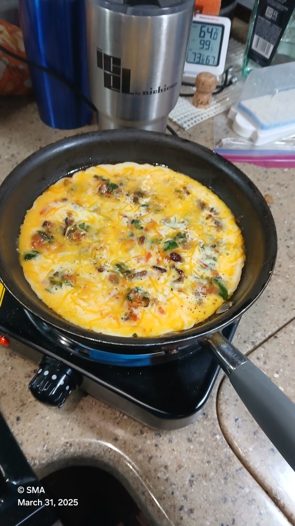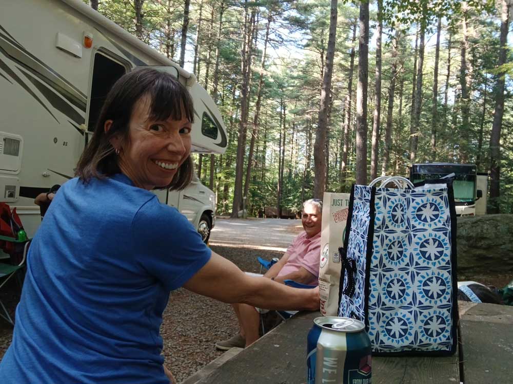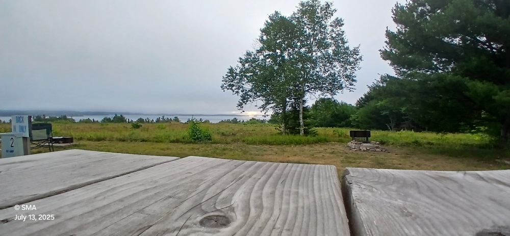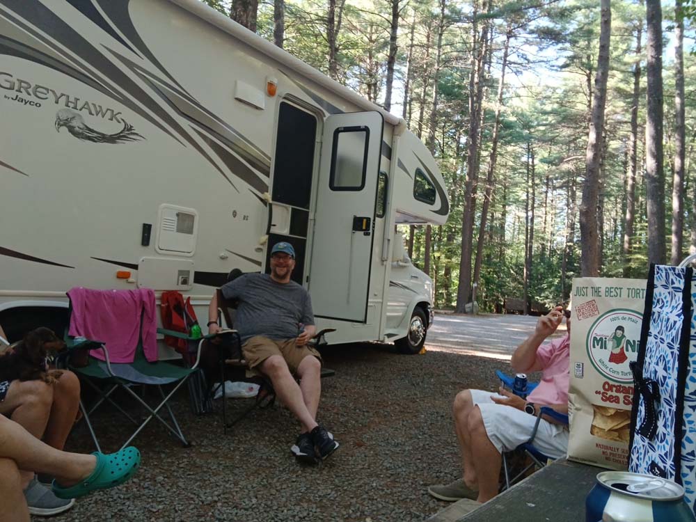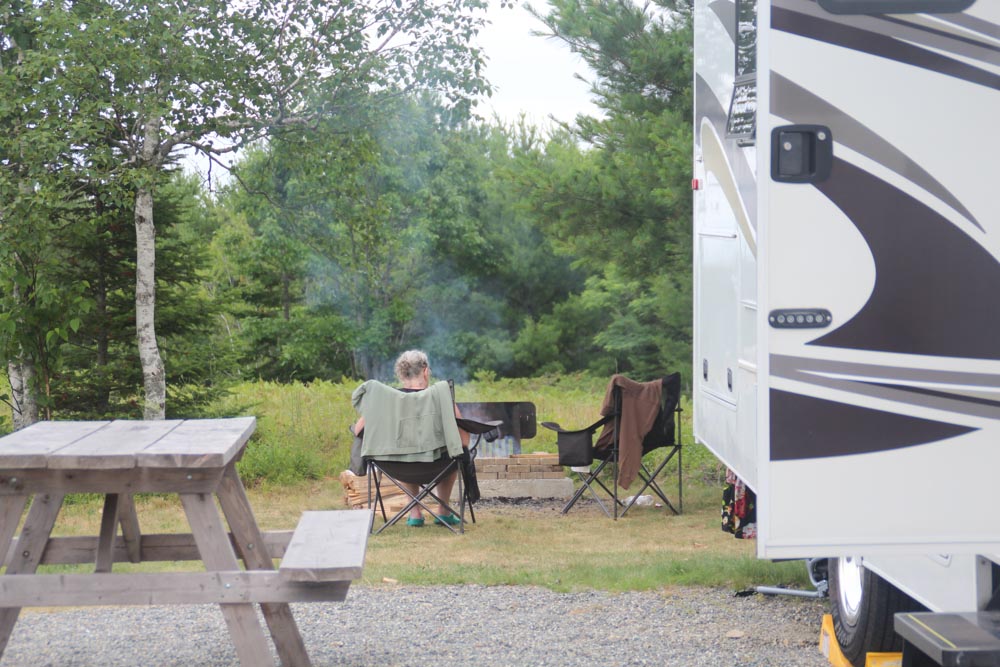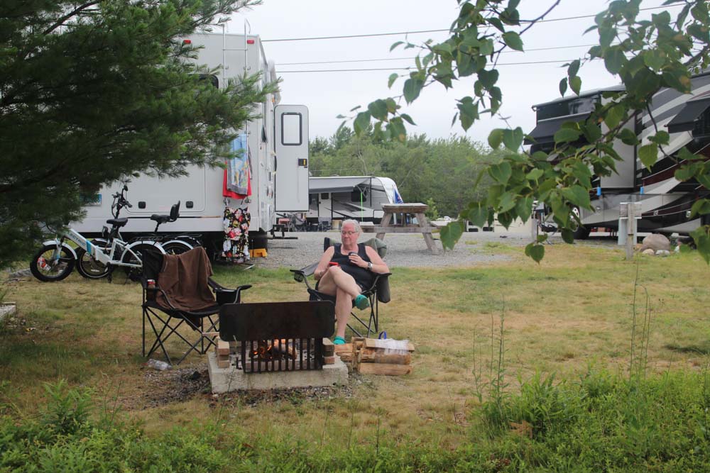 What a difference in weather. Got up this morning and you would think it’s mid-September. Very breezy and chilly but very sunny. Cooked up some home fries this morning. My rendition of home fries includes jalapeños, onions, potatoes and spices. The onions and jalapeños can be overwhelming if cut and cooked in the coach, so outside I went preparing and cooking the food. Eggs we cooked in the coach and proceeded to eat outside enjoying the brisk Maine morning air.
