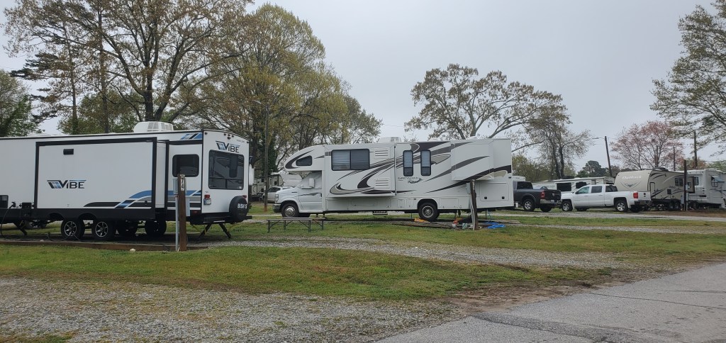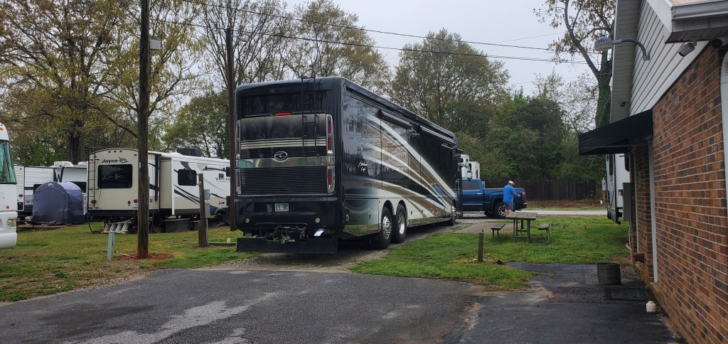 On our way to Greenville, SC. Really no traffic to speak of while trekking the 240 miles or so. Nice flat roads for the most part, majority of the route was RT85 south.. The campground is on the “other side of town”. I’ve been told the area not too far from here is a crime area, but the park is really nice and quiet. Many RV’ers here are full time permanent folks. It truely is a small world; The manager of the site (Paul) is a Ham Radio guy (spotted the antenna by his RV). His call sign is WF1G, the 1 can designate a North East call sign (like mine). Paul is from Waterbury CT and worked at Yale in the IT department. Like I said, a small world.