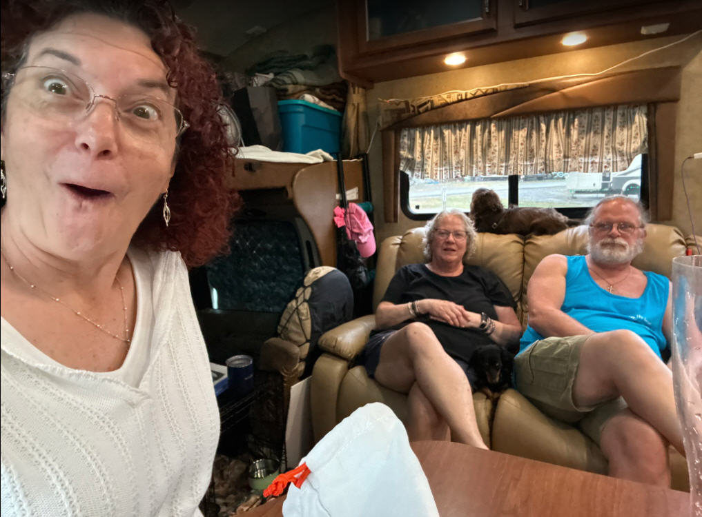Well, yesterday the levelers continue to elude us, so the big slide isn’t being deployed. This makes for a bit more cramped living area but still livable. We are super fortunate that the weather hasn’t been really too hot and just running the fans and windows open makes for very comfortable temps in the coach. At night it’s been chilly, chilly enough to wear sweats and shut the windows at night.
