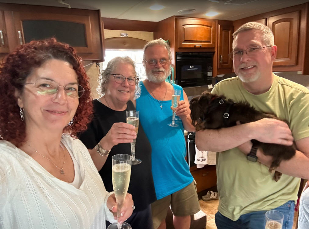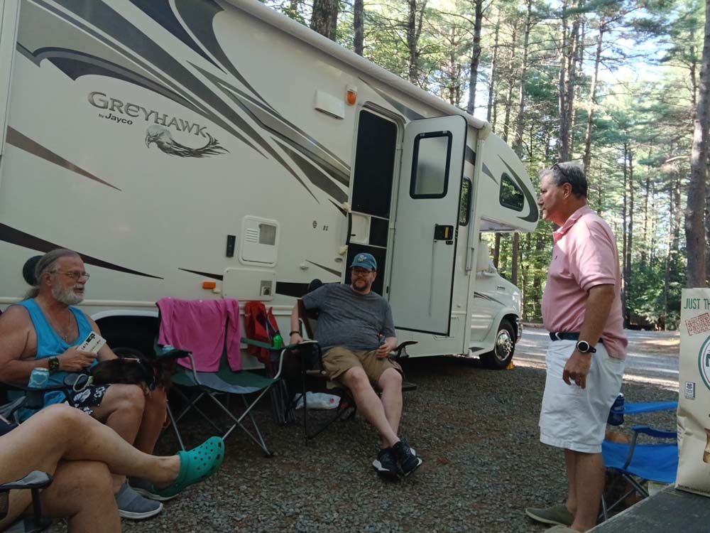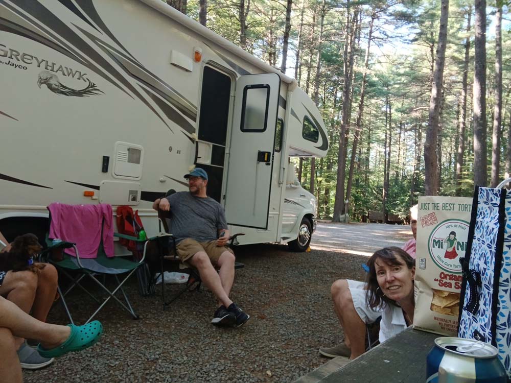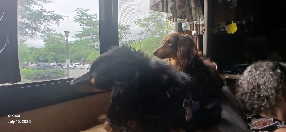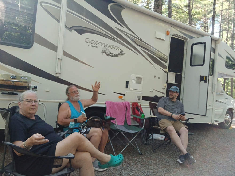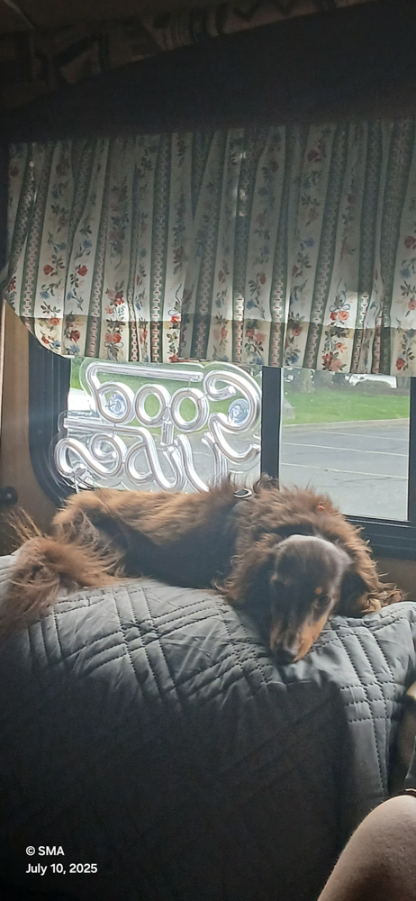 Yesterday was perfect weather, sunny but not too hot. Our heavily wooded and shade protected campsite only added to the perfection of having guests over for the afternoon. Brian & Maryrose and Jeff & Chrissy really was a nice visit. Shared family stories, current events, and had a few brews during the conversation. We were fortunate to be located where the local pizza shop delivers to the campground, so we ordered up a couple pies and finished up the day with a few slices and more stories. Thelma & Louise needed to be front and center and sat with us outside while we visited. Chrissy took Louise away for a short walk which I think both really liked.