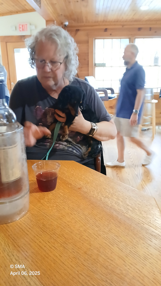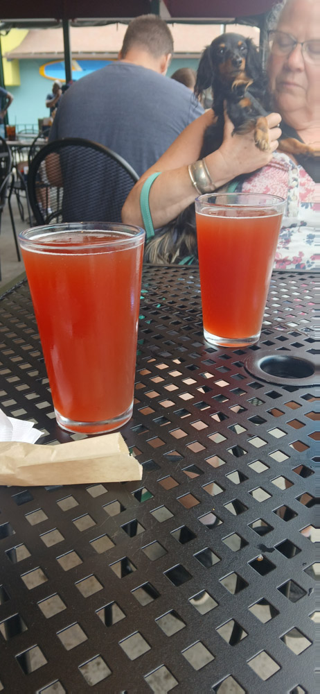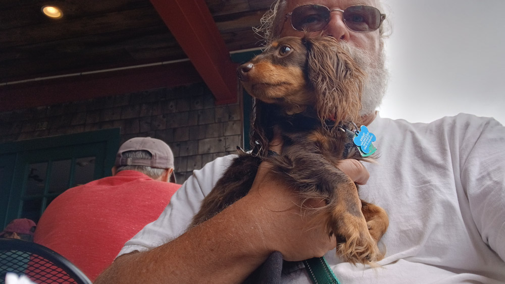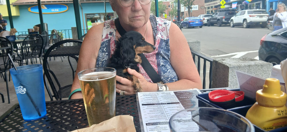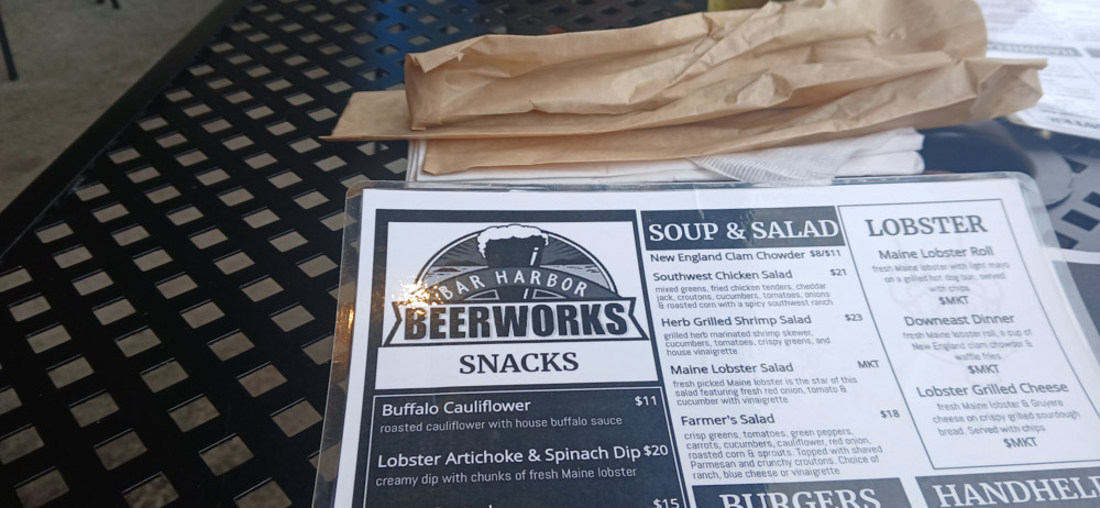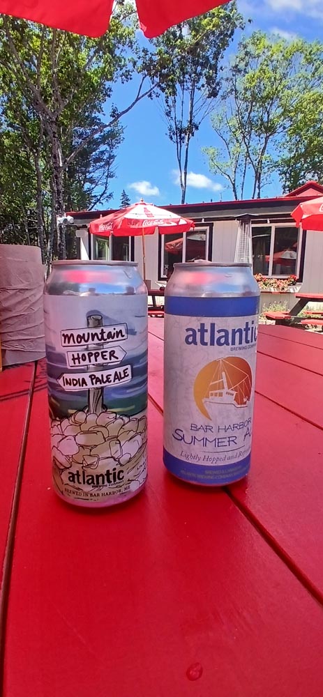 We arrived at the green about 11:30AM and walked directly to Bar Harbor Beerworks just as they opened. We enjoyed a nice sour, burger, fish ‘n chips and fried mozzarella. Afterward we walked to the liquor store and picked up a few beers since we still have a few days left at the campground. Lucky I had a backpack and so we stuffed the beers into the pack and away we went. The pups are people magnets, and all along our walk so many folks were saying “oh, how cute” and many many “oh, can I pet them”. A few times kiddingly I replied “it’s $10 for loving up the pups”.