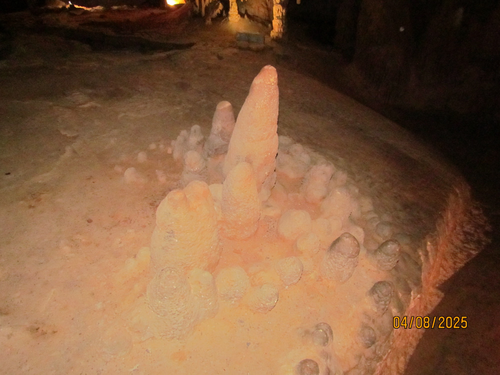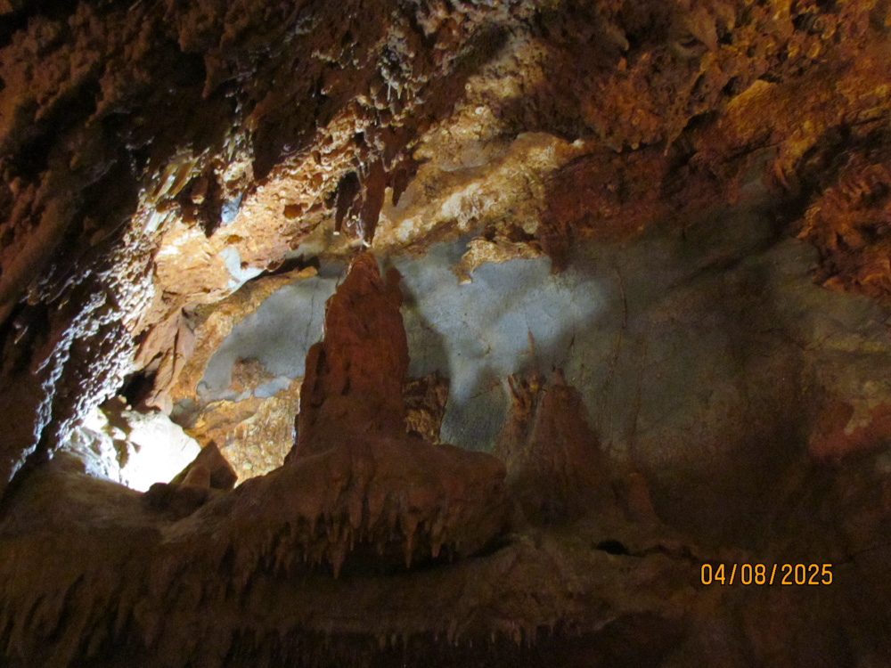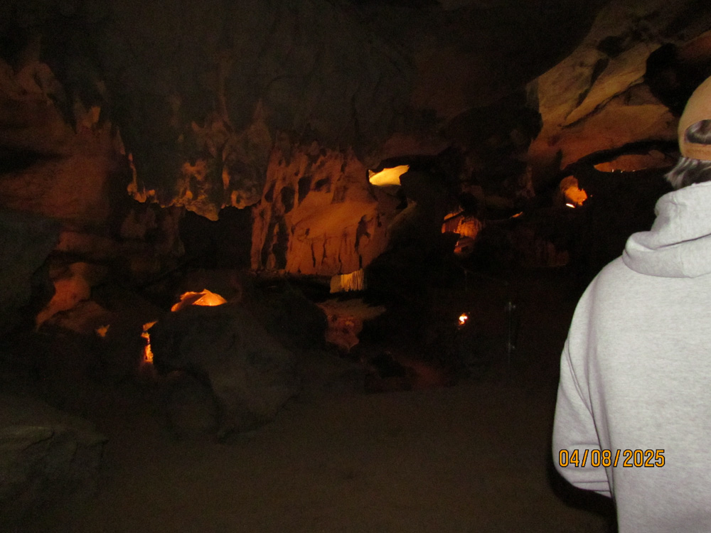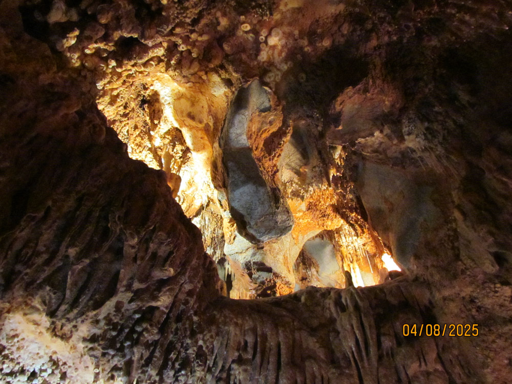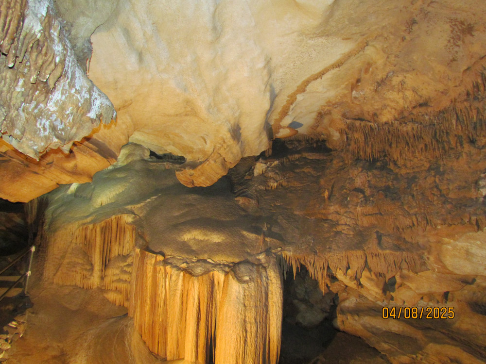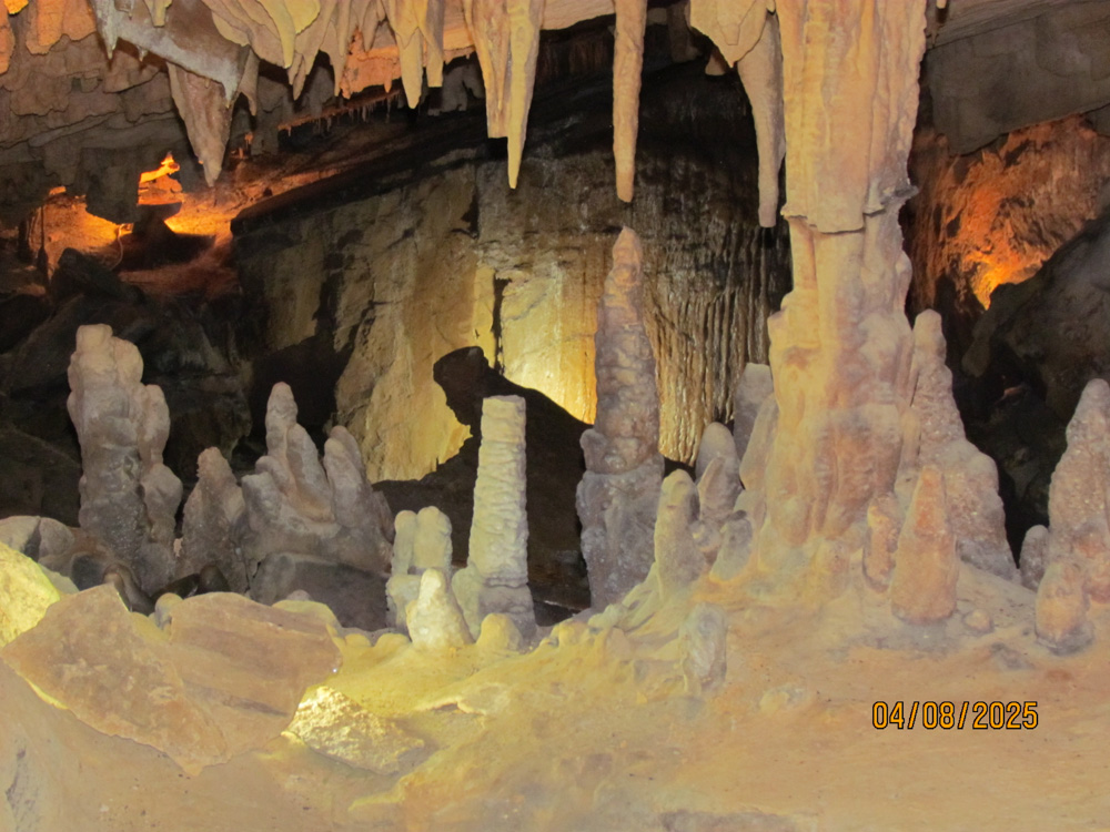 After a good night sleep, off to the showers we trekked at 5 AM. Very chilly this morning on the walk to and from. We started the laundry, then showered. All the morning chores and garbage taken care of by 8:30AM so we headed off to the entrance of the park and signed up for the 10 AM Cavern tour with Jay. The buildings, including the registration area, were all build from 1920 through 1927 by the then owner Colonel Brown from Lime Stone from the local quarry. The cave discovery was actually discovered bytwo boys in October 1879, while hunting rabbits on the property of Ruben Zirkle. The boys cornered a rabbit behind an outcropping of limestone rocks and began moving some of the loose stones to flush the rabbit from his hiding place. After doing this they discovered a hole in the ground and ran back to the house to grab some ropes and candles. After going into the hole, the boys found that there were many chambers and rooms. Not long after the discovery, the Zirkles began doing candle lit tours through the cave. In 1919, the cave was bought by Colonel Brown who had the cave fully electrified for the August 1920 grand opening with a lighting design by Phineas Stephens. In 1928 more electric work was done and to this day more than 80% of the wiring is still in use.