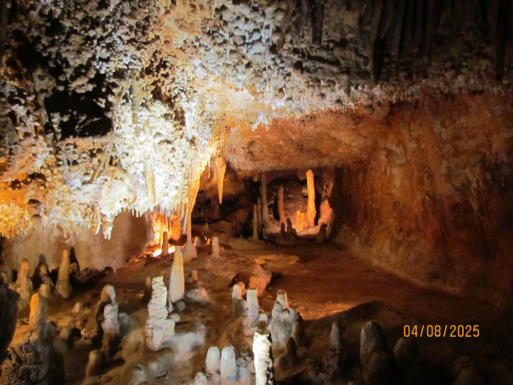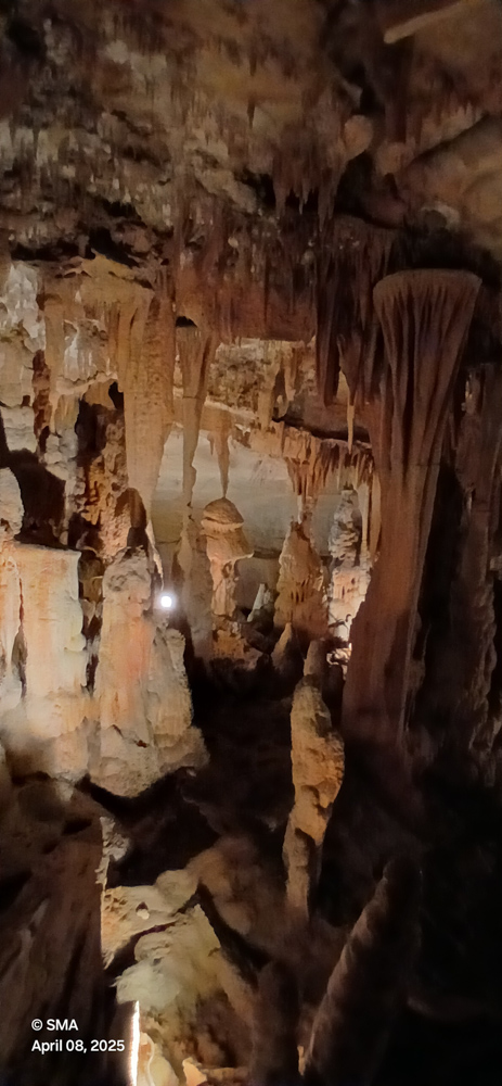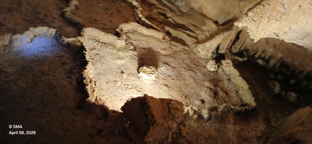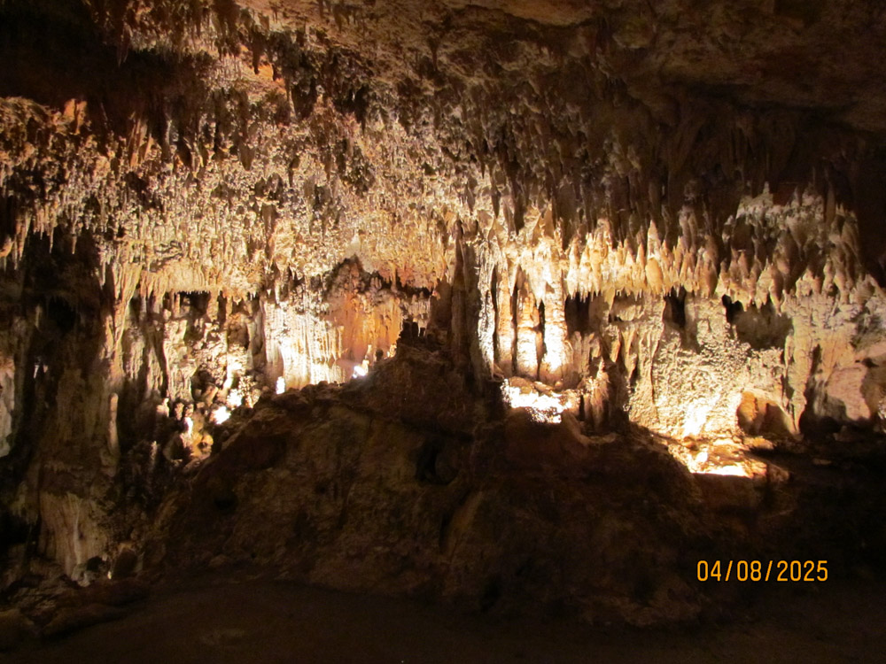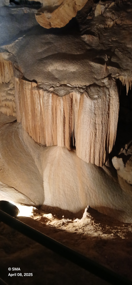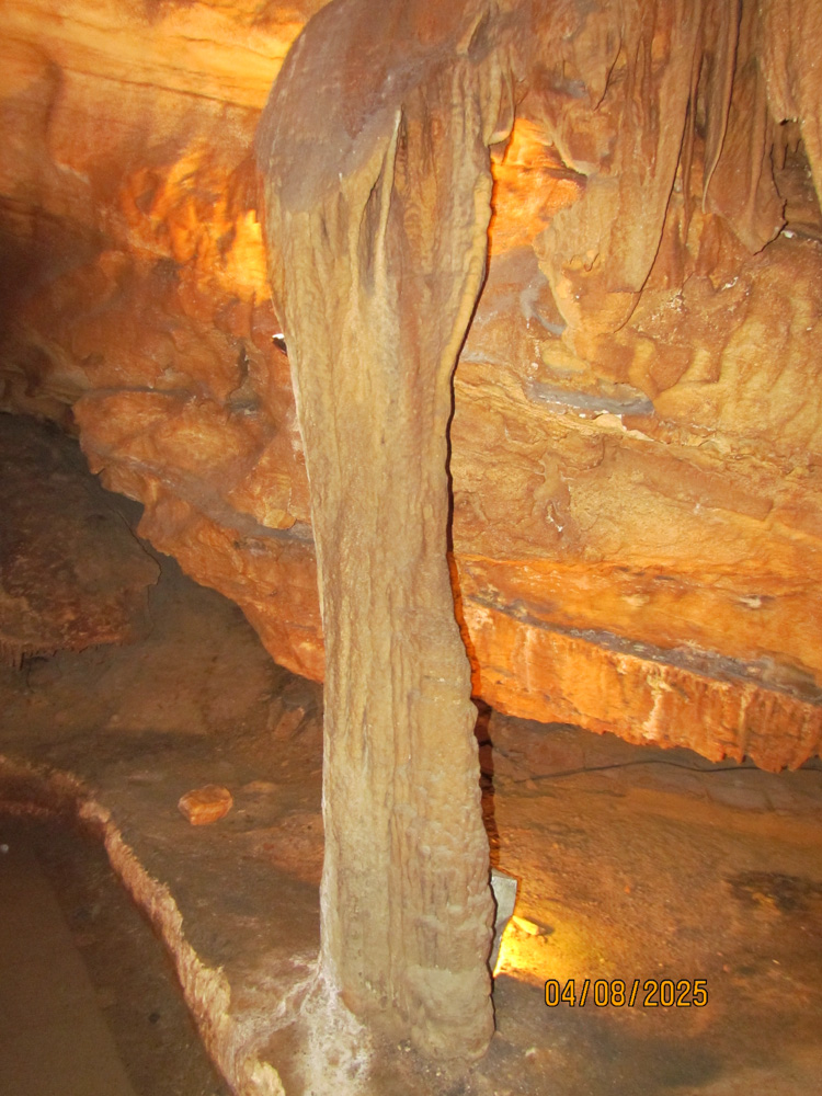 After a good night sleep, off to the showers we trekked at 5 AM. Very chilly this morning on the walk to and from. We started the laundry, then showered. All the morning chores and garbage taken care of by 8:30AM so we headed off to the entrance of the park and signed up for the 10 AM Cavern tour with Jay. The buildings, including the registration area, were all build from 1920 through 1927 by the then owner Colonel Brown from Lime Stone from the local quarry. The cave discovery was actually discovered bytwo boys in October 1879, while hunting rabbits on the property of Ruben Zirkle. The boys cornered a rabbit behind an outcropping of limestone rocks and began moving some of the loose stones to flush the rabbit from his hiding place. After doing this they discovered a hole in the ground and ran back to the house to grab some ropes and candles. After going into the hole, the boys found that there were many chambers and rooms. Not long after the discovery, the Zirkles began doing candle lit tours through the cave. In 1919, the cave was bought by Colonel Brown who had the cave fully electrified for the August 1920 grand opening with a lighting design by Phineas Stephens. In 1928 more electric work was done and to this day more than 80% of the wiring is still in use.