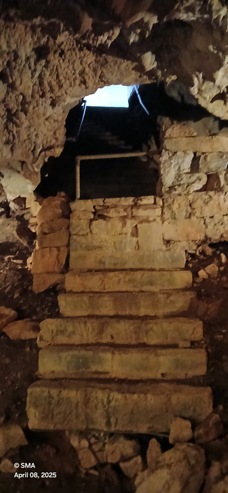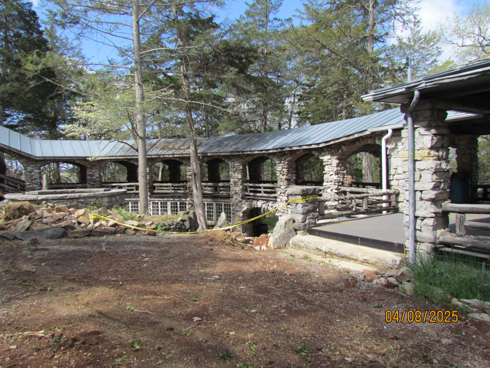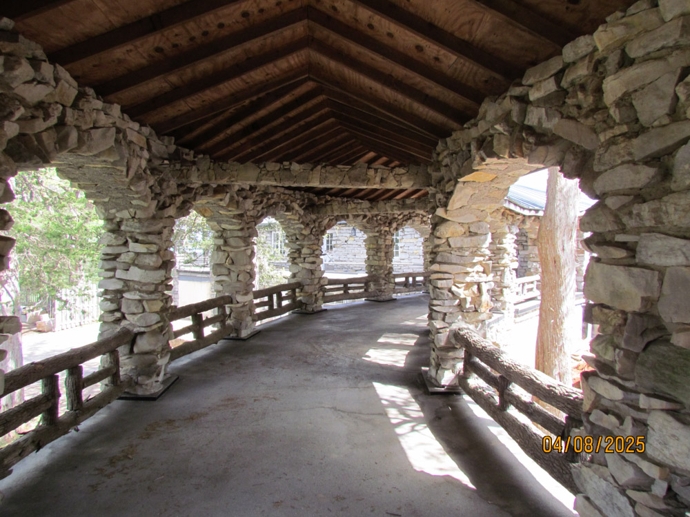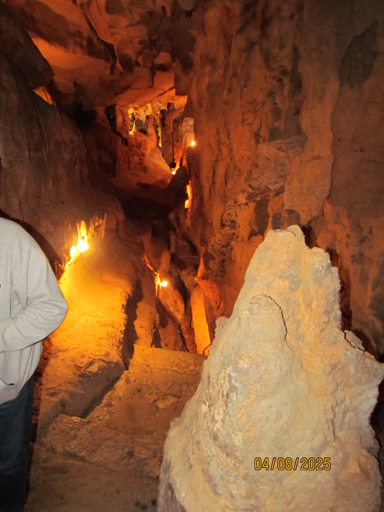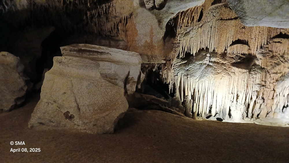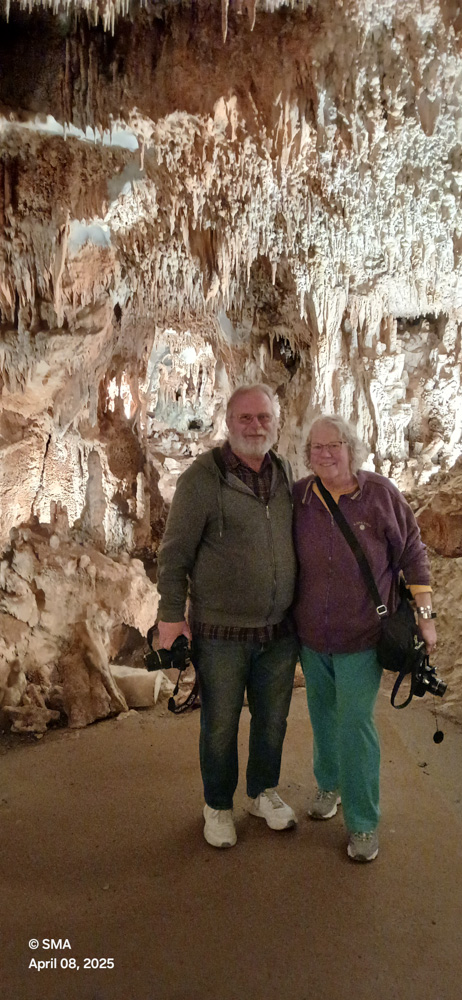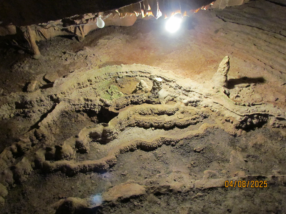 After a good night sleep, off to the showers we trekked at 5 AM. Very chilly this morning on the walk to and from. We started the laundry, then showered. All the morning chores and garbage taken care of by 8:30AM so we headed off to the entrance of the park and signed up for the 10 AM Cavern tour with Jay. The buildings, including the registration area, were all build from 1920 through 1927 by the then owner Colonel Brown from Lime Stone from the local quarry. The cave discovery was actually discovered bytwo boys in October 1879, while hunting rabbits on the property of Ruben Zirkle. The boys cornered a rabbit behind an outcropping of limestone rocks and began moving some of the loose stones to flush the rabbit from his hiding place. After doing this they discovered a hole in the ground and ran back to the house to grab some ropes and candles. After going into the hole, the boys found that there were many chambers and rooms. Not long after the discovery, the Zirkles began doing candle lit tours through the cave. In 1919, the cave was bought by Colonel Brown who had the cave fully electrified for the August 1920 grand opening with a lighting design by Phineas Stephens. In 1928 more electric work was done and to this day more than 80% of the wiring is still in use.