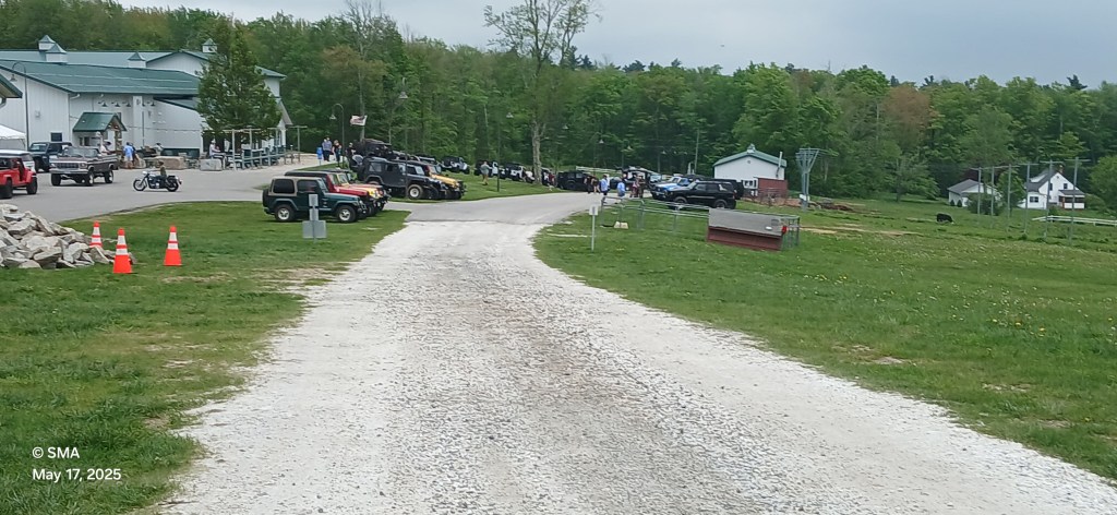 On a much better note we had a great visit with Mike & Ellen. We got to catch up on some crap, some sad some not so sad. It was terrific seeing M & E, enjoying some brews and burgers and nearly hoodwinked by Mike to buy him a red Jeep! Today was the Go Topless event. Very interesting event with a ton of 4-wheelers, mostly Jeeps, at the event. Lots of people and the weather was perfect; Rained in the morning but by 2PM the sun was out and was 80 degrees. Andy and Robin came a bit later and chilled out with us and the pups came down to the bear garden and chilled with us (really they were there for all the affection folks were giving them.