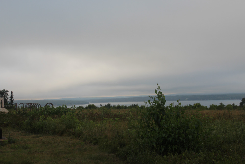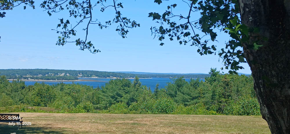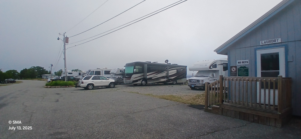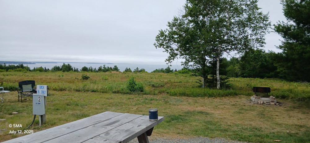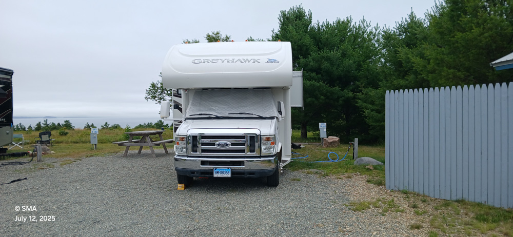 Great night sleep, cool night that dropped to the lower 60’s. A very foggy morning but we are in no hurry to get on the road since check in isn’t until 2PM at our Bar Harbor destination. But we did get on the road by 9AM and took a slow approach to Bar Harbor. Nice day for driving, not a lot of traffic and wasn’t real sunny. Stopped off in Ellsworth to pick up some groceries and arrived at the campground by 12:15PM. Nice level spot overlooking Frenchmen’s bay. All set up within 15 minutes only to realize the leveling hydraulic jacks are malfunctioning. We spent about an hour futzing with them and calling mobile RV tech guys but being the weekend we are out of luck until Monday. The down side is the main slide can not be pushed out without the levelers doing their job. The site is perfect with a very large wild blueberry field right behind our spot.