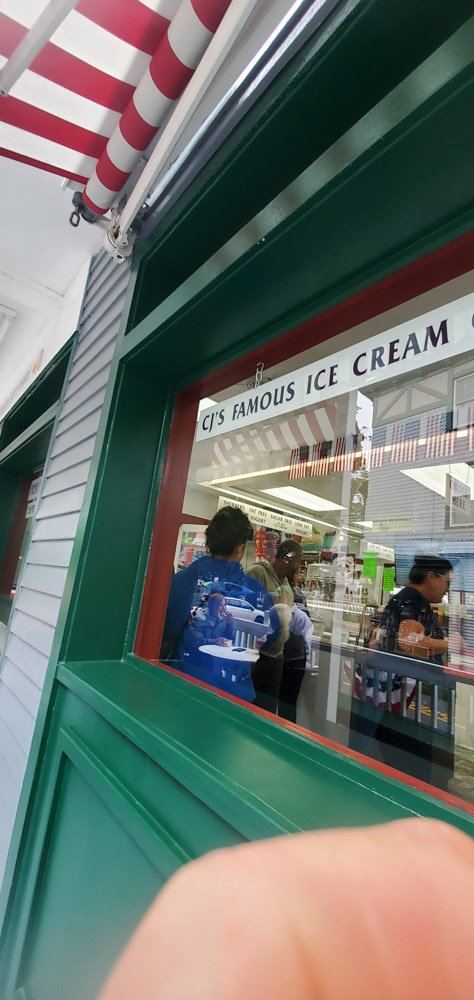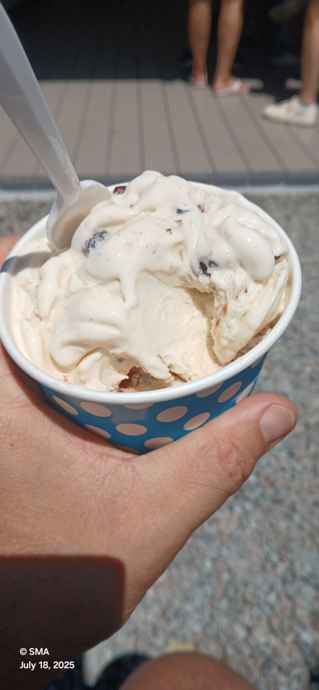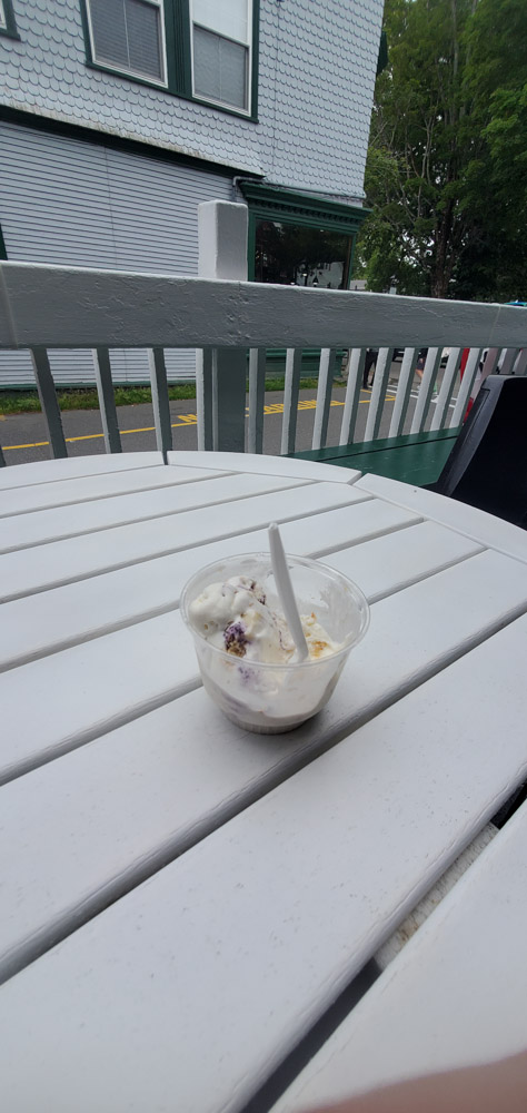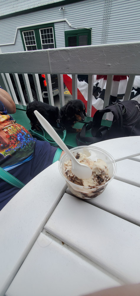 Yesterday was an overcast day and temperatures only in the low 70’s. Our plans for this trip was to get to downtown Bar Harbor a few times and yesterday seemed like a good day to make the trek with the pups. We hopped on the bus and arrived at the green just before 11AM. One of the local ice cream shops serves up sugar-free of the desired treat so we sat outside CJ’s until they opened. This place is a small mom & pop business and we got to witness a good lesson for today’s youths… you know, the ones where everyone gets a trophy and the “whatever” crowd. The owner was late opening up the shop because the kid that was suppose to open was late and not the first time this week. The kid earns $27 per hour with tips and is not 18 yet (BTW, I was making $2.15 per hour at his age). The owner arrived about 10 past 11AM and proceeded to lecture the kid in front of customers and ended with “get out of here, your fired!” The owner apologized to the customers but also said “I don’t even make $27 per hour and I’m the owner”. So many young adult just have crappy attitudes work, community, society, and good manners.