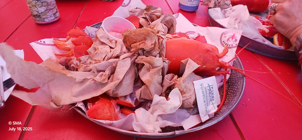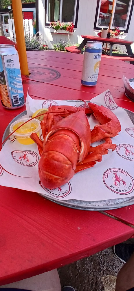 Yesterday we had our lobsah lunch at the Bar Harbor Lobster Pound which is conveniently located across the street from the campground entrance. Gone are the days of a $12 lobster dinner and come to present day price of about $33 for just the lobster or $38 if you want corn and slaw. We opted for just the lobster and were very pleased with the lunch. We’ll be heading back there before our trip is over.