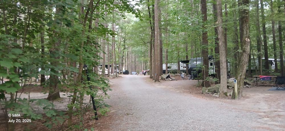 Ruth and I tried finding a grassy area for Thelma & Louise to do their duty, but this campground is mostly gravel, trees, and pine needles. We did find a spot that has some grass behind site 75, so Thelma thanked us for finding that spot. But last night the dogs didn’t do well and no peeing before bedtime. 4:20AM the pups were barking “get me out, I gotta go!” So we got an early start today.