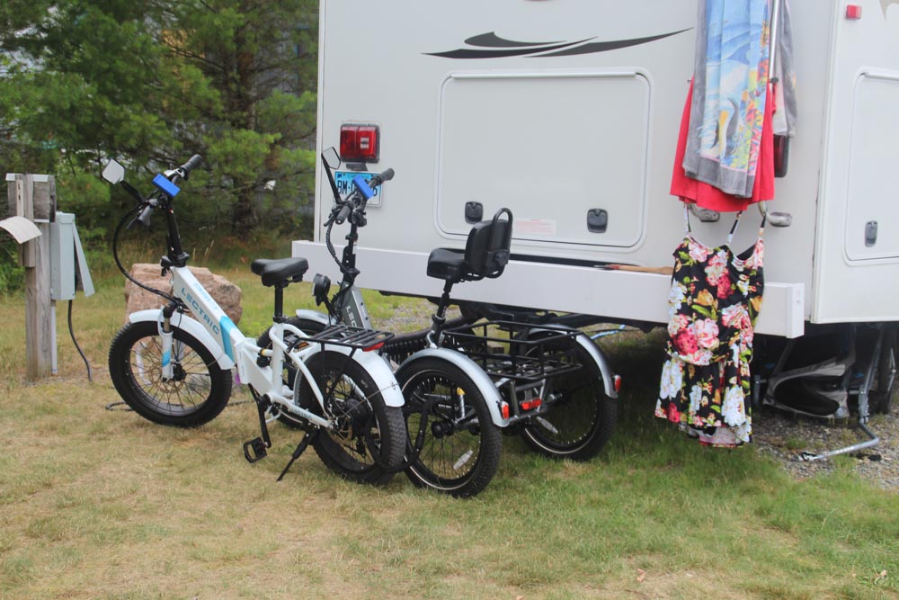 Another couple weeks and we will be back on the road again, this time to see a friend in upstate Vermont and maybe cross into Canada? The self-design leveling jack system works like a charm; cost was under $50 while Big Foot wanted $935 for a new controller. My design works great and is really quite simple with not much to go wrong. We bit the bullet and purchased a tow mounted bike rack for both the trike and bike. Very heavy duty and is a two person lift to get it on the hitch as well as loading the bikes. No folding bikes and putting in the coach basement. Now we have lots of room in the basement so we moved food and staples that was in the overhead bed area to the basement and there is still tons of room left. We relocated the vacuum to make getting the slide in and out easier. Sanitized the fresh water tank this week, always an easy task. The house battery disconnect relay is on order, the current one is still working and I relocated where it’s mounted so there is no physical interference from the house battery now. The house battery banging up against the relay probably is what was causing the issues. The air conditioner will be replaced sometime around the 15th. Stay tuned for more adventures in a few weeks.